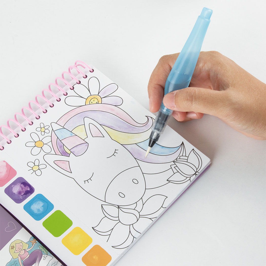 Le bloc de peinture aquarelle offre une expérience créative véritablement magique : chaque page comprend une palette d’aquarelle intégrée, il suffit donc aux enfants d’ajouter de l’eau au pinceau fourni dans le kit pour commencer à peindre.